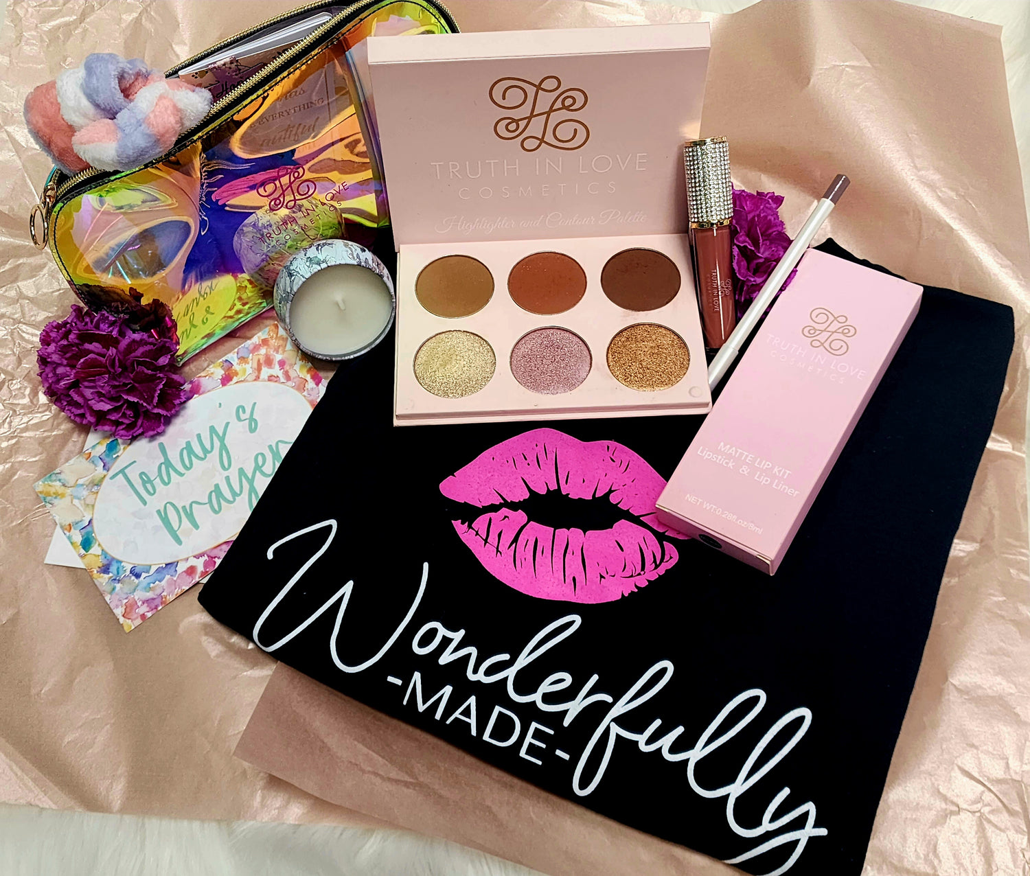 Perfect for every occasion Uplift her with our Inspirational Beauty Box, our 16 piece beauty box comes with a TIL Cosmetics Matte Duo Lip Set* , TIL Highlighter and Blush Palette, TIL Empowerment Tee*, TIL Cosmetic Bag , Prayer Card and 12 Piece Spa Gift Set with Soy Candle.
